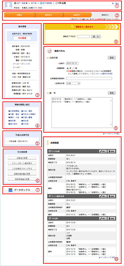 - お客様名、建物名、案件名、点検名など、この案件の概要を表示します。